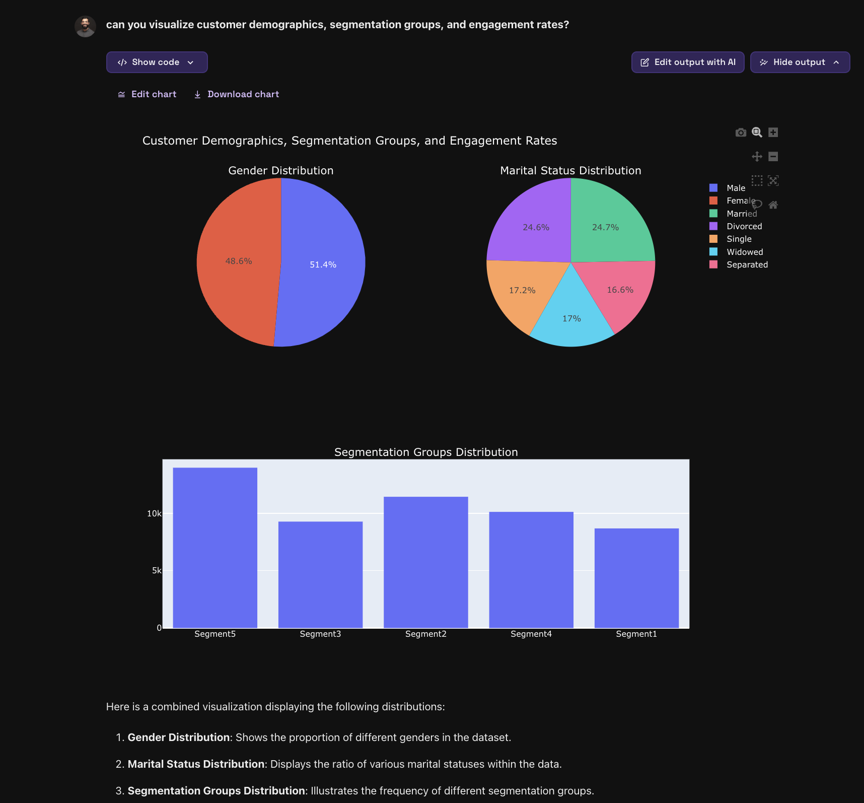 To get an initial understanding of the data, we will ask Vizly for an overview of key marketing metrics such as customer demographics, segmentation groups, and engagement rates.
